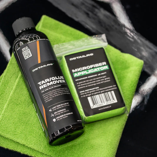 Detailrs Tar and Glue Remover met groene microvezeldoek voor auto achterruit reiniging
