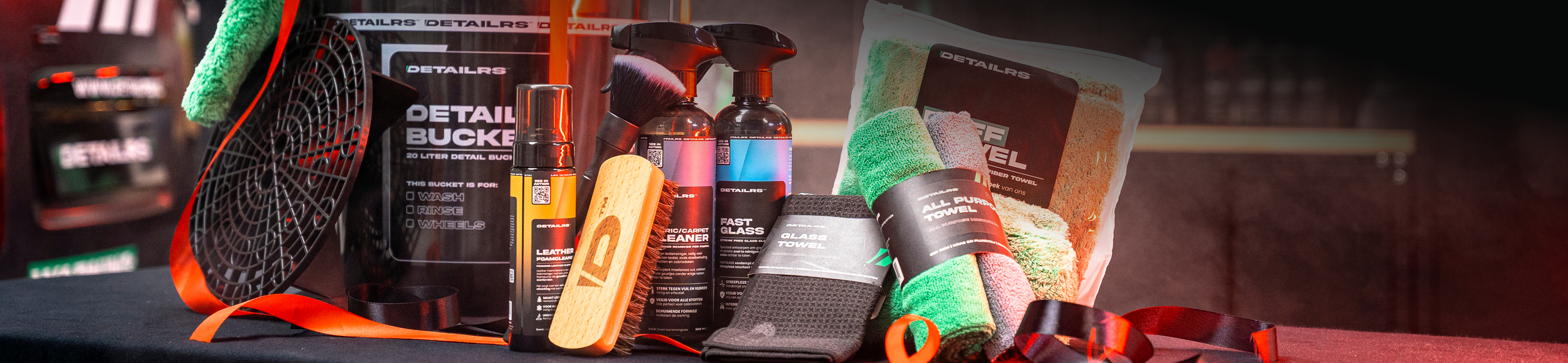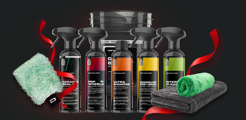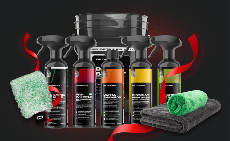 Dit ontvang je: Ceramic Seal 2.0, Ultra Shampoo, PRP Wheels 2.0, Dissolve Pre-Wash, Interior Cleaner, Detailbucket 20L, Dirt Trap, Magnet Towel, Microfiber Washmitt, 2x Buff Towel, Fabric Carpet Cleaner, Leather Foam Cleaner, Fast Glass, Glass Towel, 2x All Purpose Towel en een Soft Detailing Brush + Horse Brush.
