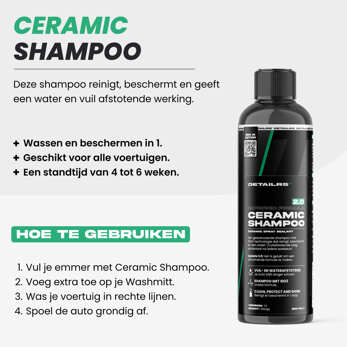 - 4 Weken bescherming per wasbeurt.