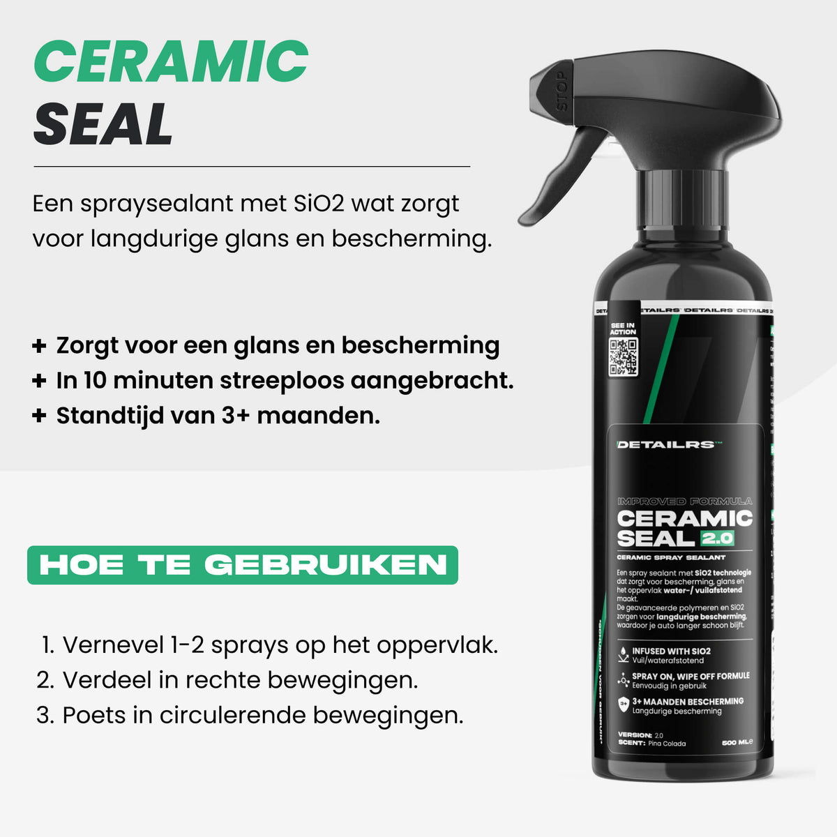 Ceramic Seal is een spraysealant met SiO2 wat zorgt voor langdurige glans en water- en vuilafstotende bescherming op elk voertuig en oppervlak.