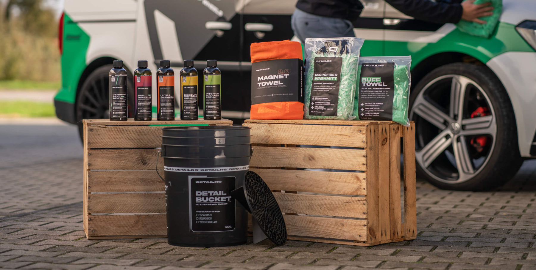 Dit ontvang je: Ceramic Seal 2.0, Ultra Shampoo, PRP Wheels 2.0 , Dissolve Pre-Wash, Interior Cleaner, Detailbucket 20L, Dirt trap, Magnet Towel, Microfiber Washmitt, Buff Towel